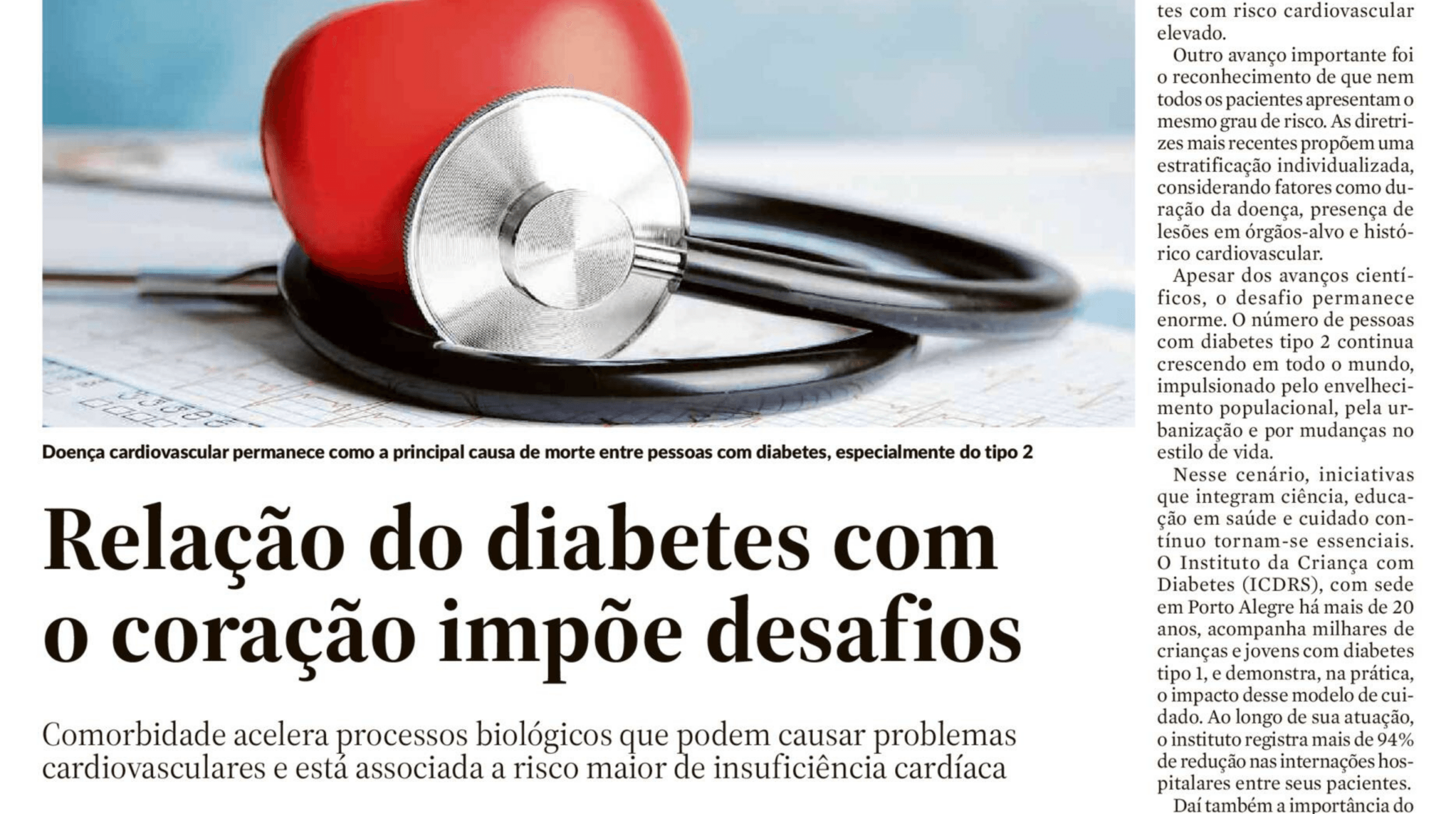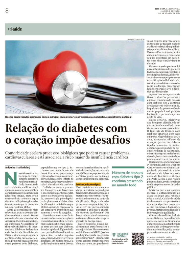 O Instituto da Criança com Diabetes (ICDRS) ampliou sua presença na imprensa no último fim de semana com a publicação de um artigo no Caderno Vida, do jornal Zero Hora, abordando a relação entre o diabetes e as doenças cardiovasculares — um importante desafio para a saúde pública na atualidade.